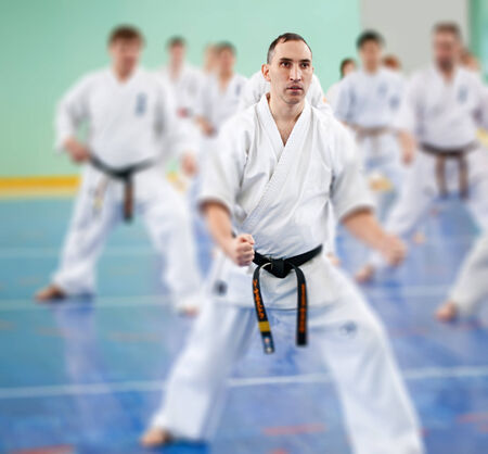 Concept karate, martial arts. Construction of students in the hall before training. Kimono, different belts, different levels of training. Close up,