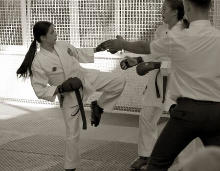 Young woman practicing karate in the gym. Close-up.