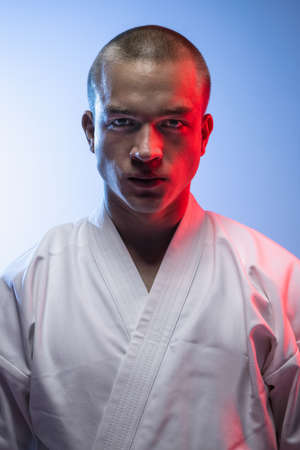 Cropped portrait of young karate sportsman wearing white kimono isolated over black background. Mixed light effect