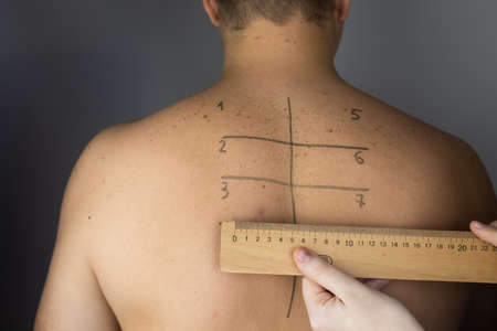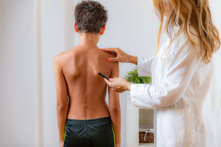 Pediatric doctor examining posture of a boy, making marks on his back, checking angle of scapula bones.