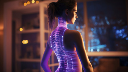Digital composite of a woman's illuminated spine showcasing neural pathways, set in a cozy home environment.