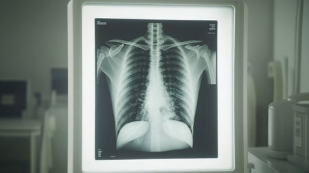 X-ray film of a patient's chest with ribs and lungs visible, clipped to a white lightbox in a hospital setting.