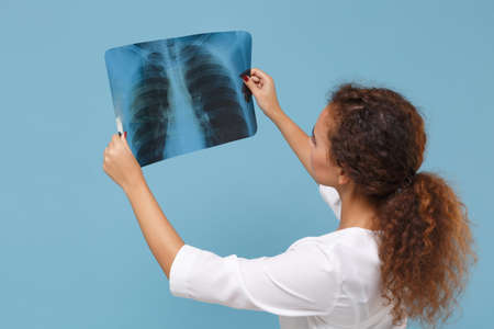 Back rear view of african american doctor woman in medical gown hold X-ray of lungs fluorography roentgen isolated on blue background. Healthcare personnel medicine health concept. Mock up copy space.