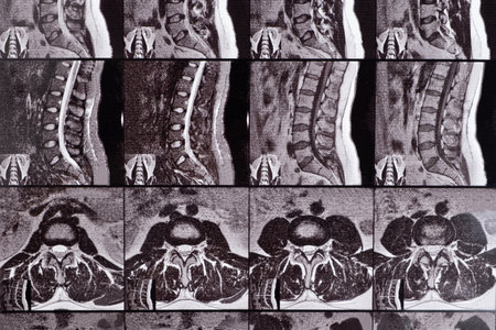 Multiple MRI cross-sections of spine on black screen in radiologist workstation