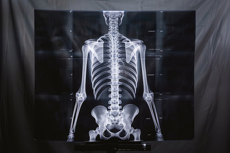 An x-ray image of an adult human skeleton, showing the bones and structure of the body, X-ray film of a human's vertebral column in 3D, AI Generated