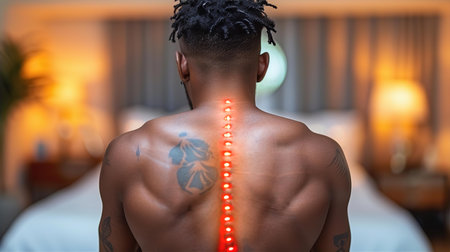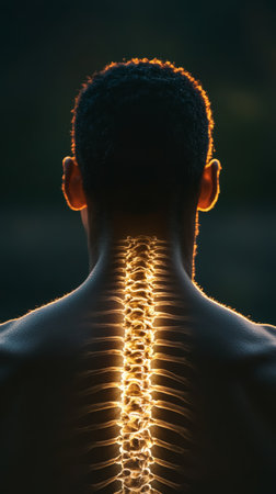 Man showing glowing spinal column with back pain, highlighting human anatomy complexity. Image emphasizes importance of proper care for managing back pain and promoting health