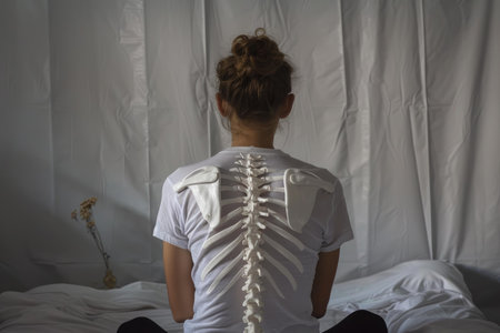 Woman is sitting on a bed, wearing a white t shirt with a plastic anatomical spine attached to it