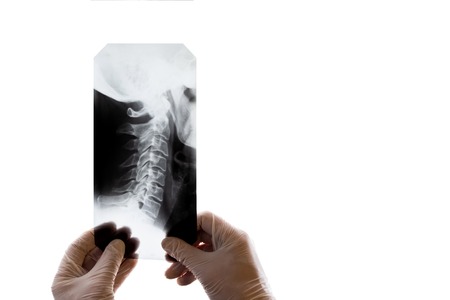 Close-up. Hands of a doctor in white gloves are holding an X-ray of the cervical vertebrae. The theme for the day of the physician and radiologist. White background. Isolated. Copy space.