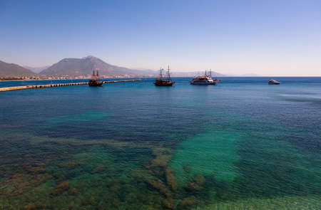 Clear transparent water of the Mediterranean Sea and ancient ships. Turkey.