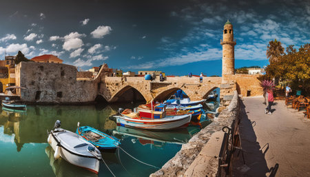 KYRENIA, CYPRUS, AUGUST 25, 2017: People are strolling among restaurants at Kyrenia harbor, Cyprus