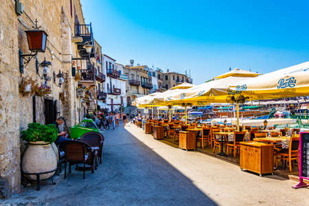 KYRENIA, CYPRUS - WINTER, 2019: Kyrenia town. Seafront Architecture. Historical and tourist place.