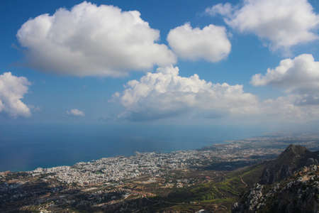 View from the castle of Saint Hilarion on the city of Kyrenia, mountains, fluffy clouds and the Mediterranean sea. Cyprus.