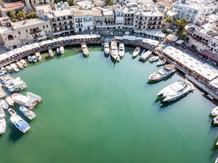 Aerial view of Sea port and Old Town of Kyrenia (Girne) is a city on the north coast of Cyprus.. 2020