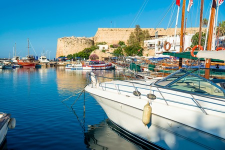 KYRENIA, CYPRUS - MARCH 22, 2013 - Scenic view of historic harbour and the old town in Kyrenia Girne on the Island of Cyprus, March 22, 2013 The Turkish army reached Kyrenia on 22 July 1974