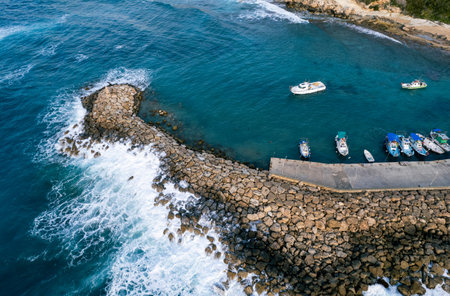 Aerial drone view of fishing boats moored at harbor at breakwater. Stormy waves at sea