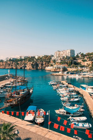 Antalya, Turkey - September 10, 2022: Harbor in the old city of Antalya Kaleici - Old Town of Antalya, Turkey