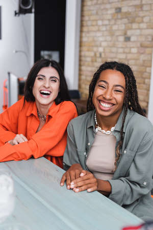 couple of young black women laughing and hugging each other happy in front of brick wall, concept of youth and friendship, copy space for text