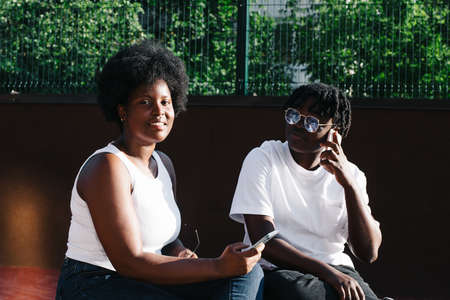 Stylish african couple taking a selfie and looking at camera. Summertime concept.