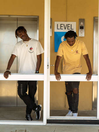 Happy pedestrian couple. Joyful African American. Stylish young people on street, youth love relationships, beauty concept