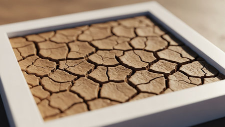 Close up of cracked dry earth texture within a white frame, showing intricate patterns.