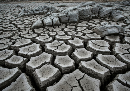 A compelling medium shot showcases a cluster of intricate, polygonal cracks in a recently dried riverbed, with weathered rocks. it evokes themes of drought, climate change, and environmental impact.
