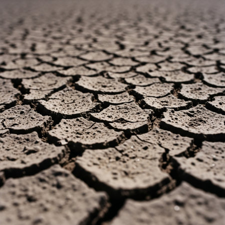 This close-up image showcases the cracked surface of dry soil, emphasizing the effects of drought and climate change on landscapes and their ecosystems.