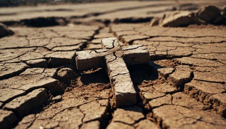 close-up of cracked and dry earth, with sun shining overhead, created with generative ai