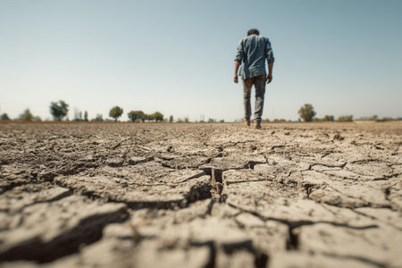Solitary farmer walks across arid, cracked soil under clear sky. Scene illustrates drought and rural agricultural crisis. Ideal for environmental reports and sustainability content