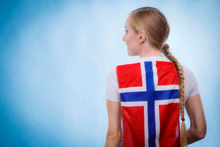 Blonde girl braid hair with norwegian flag on her back, copy space text area. Scandinavian people.