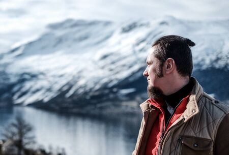 Young man posing on a background of mountains in the Norway. Man tourist hiking to beautiful mountain lake.