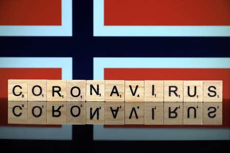 WROCLAW, POLAND - MARCH 28, 2020: Word CORONAVIRUS made of wooden letters, and Norway Flag in the background. Coronavirus (COVID-19) global disease 2020.