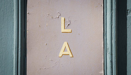 Detail of a door painted with colors and the capital letters L and A painted in golden tones.