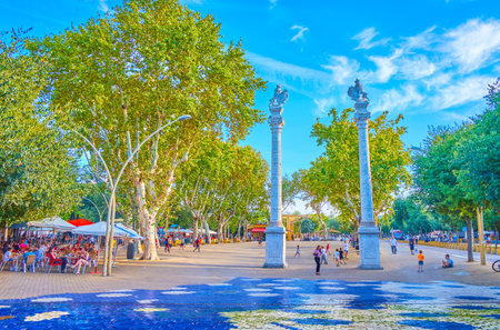 SEVILLE, SPAIN - OCTOBER 1, 2019: The famous La Alameda square with columns and sculptures of the lion atop and rows of white poplar trees on the background, October 1 in Seville