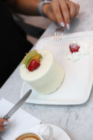 Top view Strawberries cake on white ceramic plate on Marble table background