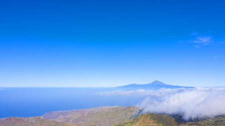 Fantastic view of Tenerife flying in the clouds. Shot with a telephoto lens from the mountain peaks of La Gomera.. Paradise for hiking. Travel postcard. La Gomera, Spain.