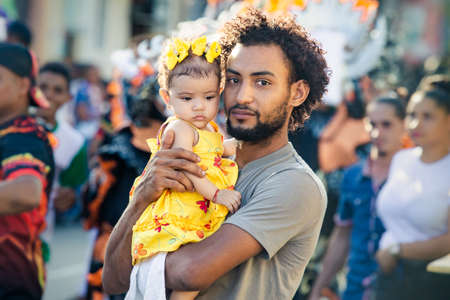 Concepcion De La Vega, DOMINICAN REPUBLIC - FEBRUARY 09, 2020: closeup portrait of dominican man holds little daughter in yellow dress on city street on February 9 in Concepcion De La Vega