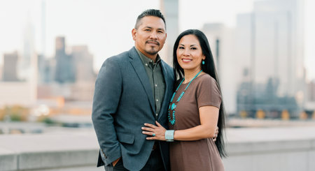 Self-assured Native American gentleman showcasing stylish braided hair and adorned with jewelry against a blue backdrop.