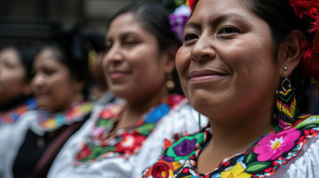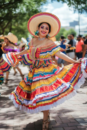 People in traditional Mexican clothing smiling and dancing outdoors, festive atmosphere, AI Generated