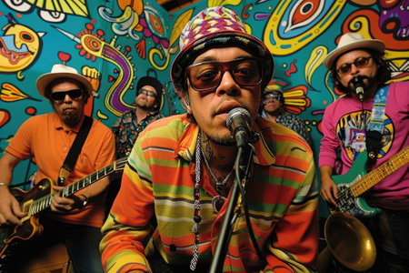 Colorful musicians playing instruments on a vibrant backdrop.