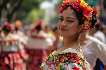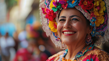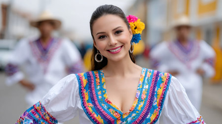 A woman wearing a vibrant Mexican costume, showcasing colorful patterns and traditional attire.. Generative AI