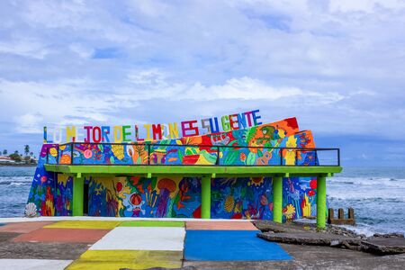 Puerto Limon, Costa Rica - December 8, 2019: The colorful welcome sign at Port Limon - seaport in Costa Rica. Sea and blue sky