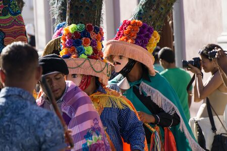 Granada, Nicaragua – February 15, 2017: People wearing traditional dress and colorful masks during celebration of Carnival. Nicaragua traditional folk