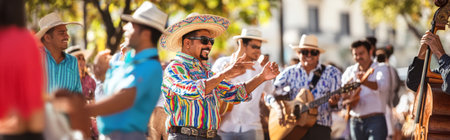 Festive street scene with smiling people in traditional Mexican clothing singing and dancing, AI generated