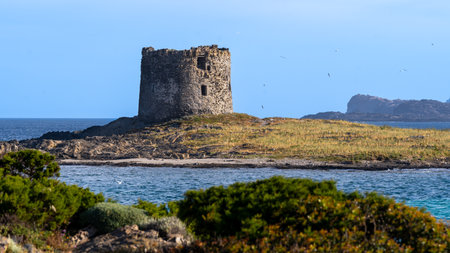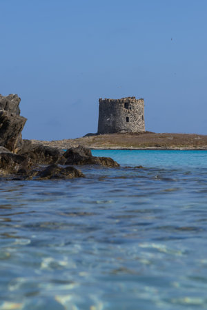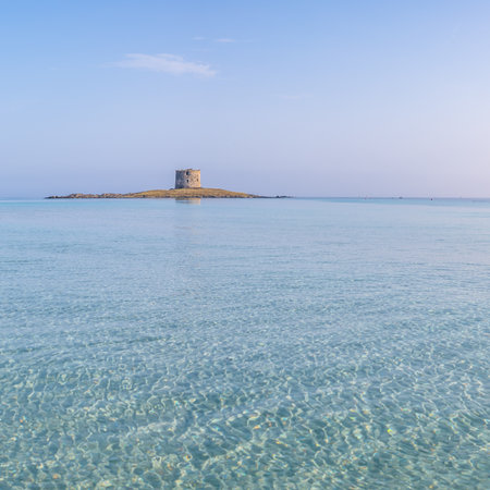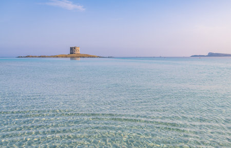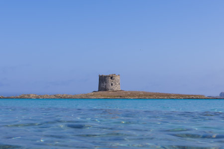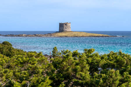 Caletta della Torre beautiful view of ruined tower on La Pelosa beach Sardinia Italy