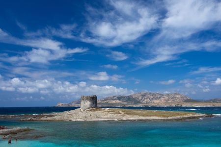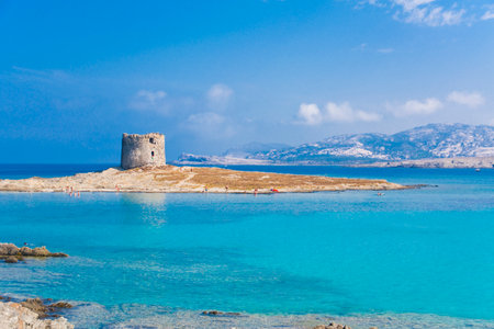 La Pelosa Beach in Stintino, Sardinia, Italy. In the background, the landmark 16th century La Pelosa Tower (Italian: Torre della Pelosa).