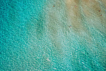 People swimming in the sea. Aerial view, Top view. The color of the water and beautifully bright. Swimming and relaxing in the sea aerial top view. Top view from flying drone.