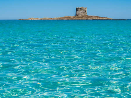 Stone tower on a beautiful turquoise blue mediterranean Pelosa beach near Stintino,Sardinia, Italy.