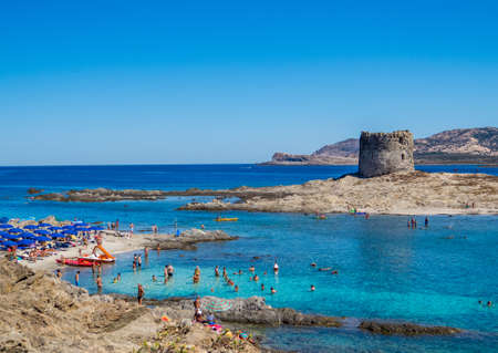 STINTINO, ITALY - JULY 20, 2016: View of the famous La Pelosa Beach with the landmark 16th century Watchtower (Italian: Torre della Pelosa) in the background.