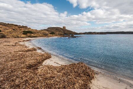 dried seaweed, Posidonia oceanica, forming banks on sand at Tamarells beach in Menorca, a Spanish Mediterranean island, after the covid 19 coronavirus crisis