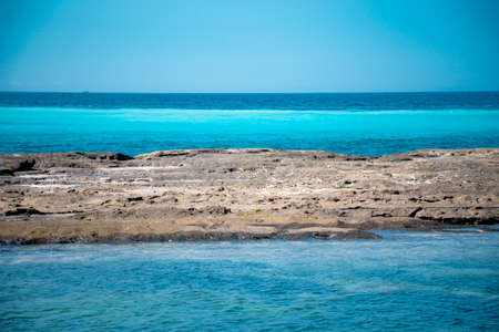 seascape with clear turquoise water among rocks and stones, in the distance you can see the horizon line